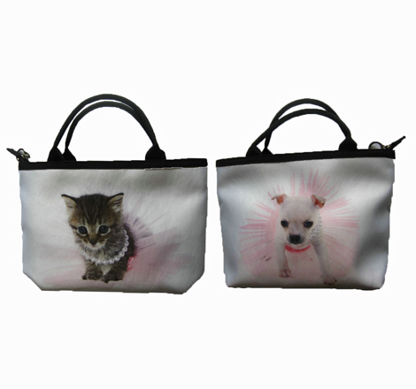 Small microfibre handbag with our very own puppy and kitten photo print! Each print on either side. 24cm x 17cm x 5cm.