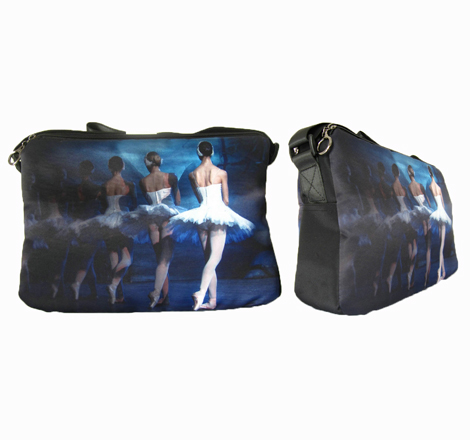 Microfibre messenger in our very own Swan Lake photo print! Top zipper. 32cm x 21cm x 10cm.