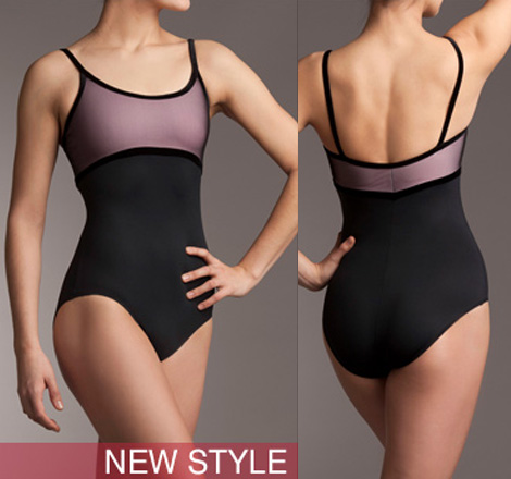 The Portia has the look and feel of a lovely lingerie piece but is still perfect for the dance studio. Great black mesh is layered over pink and trimmed with velvet. Shelf lining. 88% Nylon, 12% Spandex.