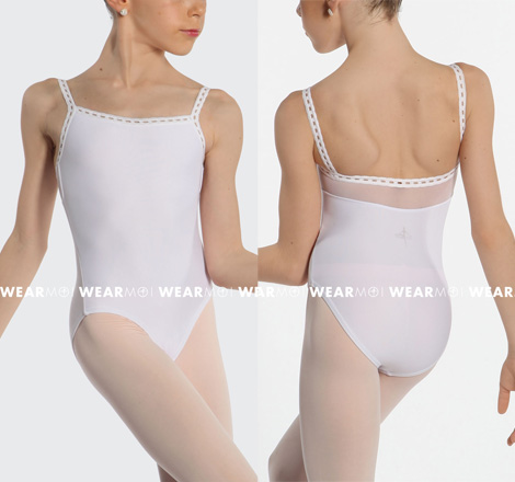 Wear Moi’s Flora leotard is made from soft meryl and features a peep-hole piping and strap. Leotard has a stretch tulle upper back and is front-lined.