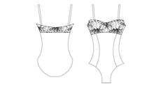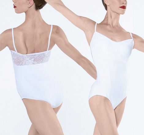 Camisole leotard with lace detail on bodice. Front lining. Soft meryl.