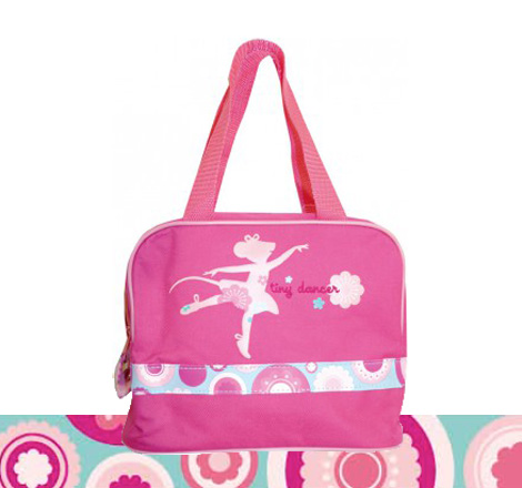 A very glamorous little bag for carrying all those ballet essentials. Featuring a dancing Angelina Ballerina. This is the perfect holdall made from a heavy weight nylon, it has pink webbing handles and has flower zip pulls. 21cm x 20cm.